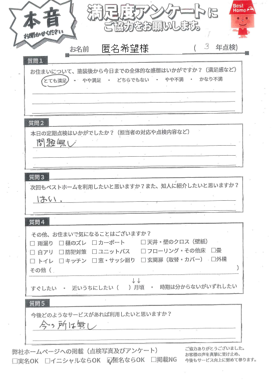 本日は京都郡苅田町新津にて3年点検に伺い、美観は維持できているか、劣化箇所や補修が必要な箇所はないか確認しました!点検結果、お客様からの声をぜひご参考ください。