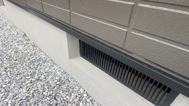 水切り:塗装時のままきれいに保たれていました!水切りを塗装することによって、雨水や土台の腐食、シロアリの発生を防ぐことができます。お住まいの大切な土台を塗装で守っています!