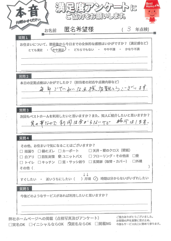 本日は古賀市舞の里にて3年点検に伺い、美観は維持できているか、劣化箇所や補修が必要な箇所はないか確認しました!点検結果、お客様からの声をぜひご参考ください。