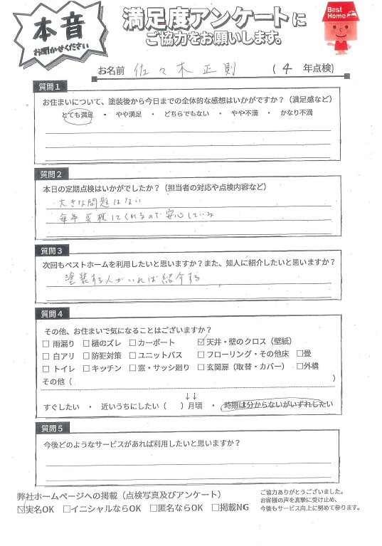 本日は田川市伊加利にて4年点検に伺い、美観は維持できているか、劣化箇所や補修が必要な箇所はないか確認しました!点検結果、お客様からの声をぜひご参考ください。