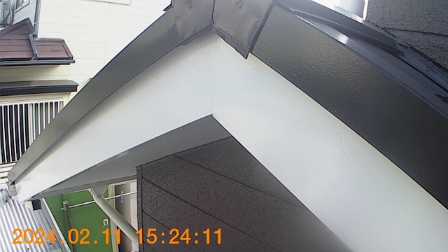 破風:屋根や外壁と比べると材質が違うため耐久年数は低いですが、塗装時のまま綺麗に保たれていました!剥がれもなく良好です!