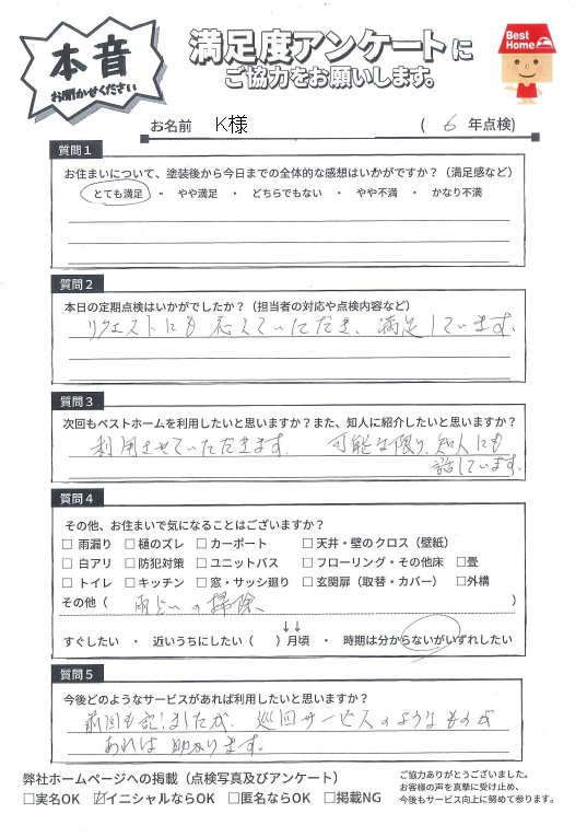 本日は遠賀郡岡垣町旭台にて6年点検に伺い、美観は維持できているか、劣化箇所や補修が必要な箇所はないか確認しました!点検結果、お客様からの声をぜひご参考ください。