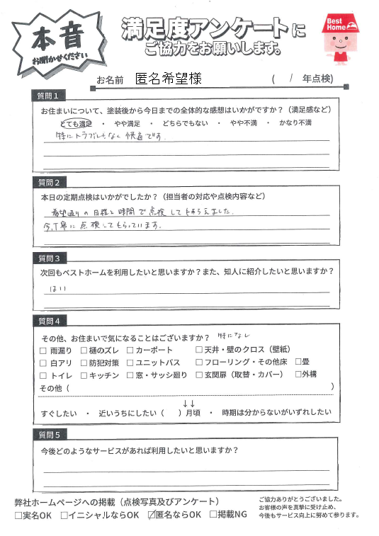 本日は小倉南区山手にて1年点検に伺い、美観は維持できているか、劣化箇所や補修が必要な箇所はないか確認しました!点検結果、お客様からの声をぜひご参考ください。