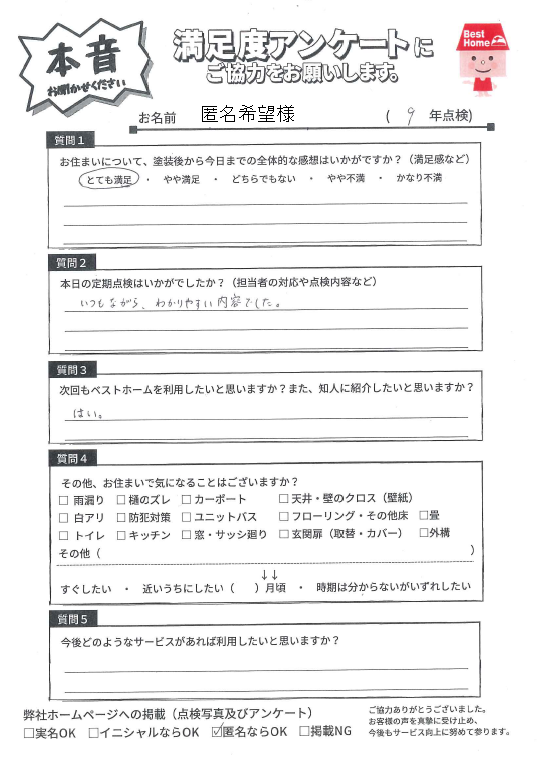 本日はみやま市高田町濃施にて9年点検に伺い、美観は維持できているか、劣化箇所や補修が必要な箇所はないか確認しました!点検結果、お客様からの声をぜひご参考ください。