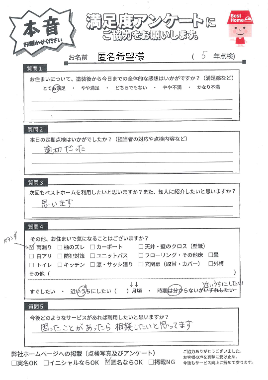 本日は小倉南区徳吉東にて5年点検に伺い、美観は維持できているか、劣化箇所や補修が必要な箇所はないか確認しました!点検結果、お客様からの声をぜひご参考ください。