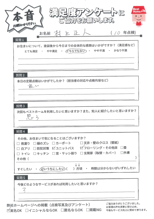 本日は行橋市東泉にて10年点検に伺い、美観は維持できているか、劣化箇所や補修が必要な箇所はないか確認しました!点検結果、お客様からの声をぜひご参考ください。