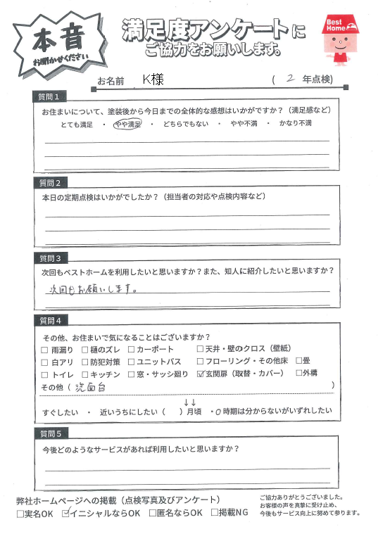 本日は小倉南区朽網西にて2年点検に伺い、美観は維持できているか、劣化箇所や補修が必要な箇所はないか確認しました!点検結果、お客様からの声をぜひご参考ください。