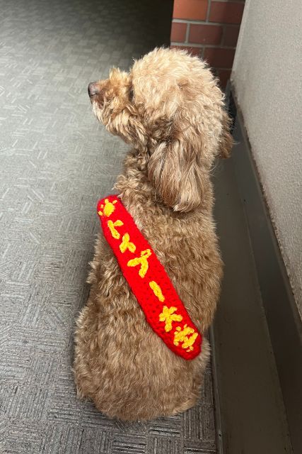 そして上がりまくったテンションを抑えられず、我が家の愛犬にもタスキを。
