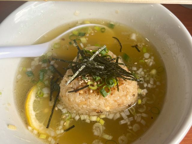 焼きおにぎりをセットで頼めるので、残ったスープに投下。