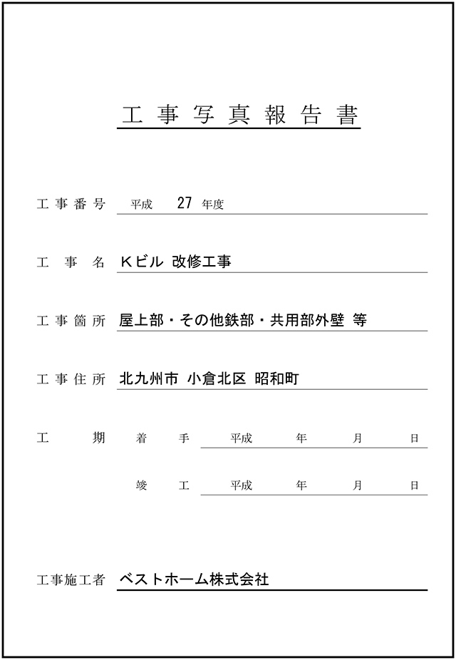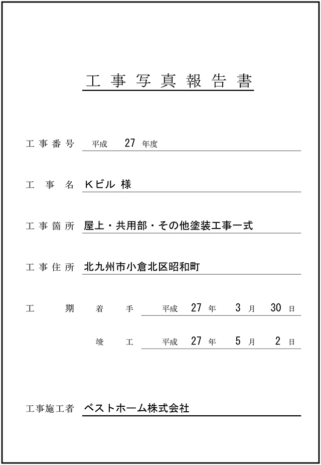 | 施工箇所 | 屋上防水部・共用部・軒天・塗床・蛍光灯カバー・非常ベル・ PS.ドア・鉄扉・エレベーター・分電盤・鉄部BOX・ ハト小屋・笠木・ドレン・保温配管 |