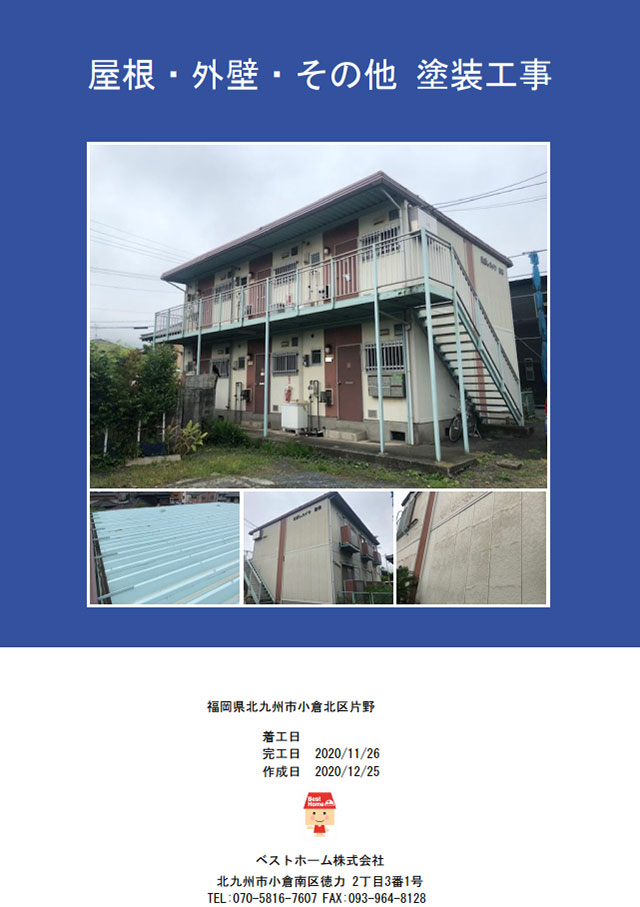 | 施工箇所 | 外壁・パラペット・共用部・軒天・雨樋・鉄骨・階段鉄部 2F廊下床・基礎・和室壁・浴室天井 |