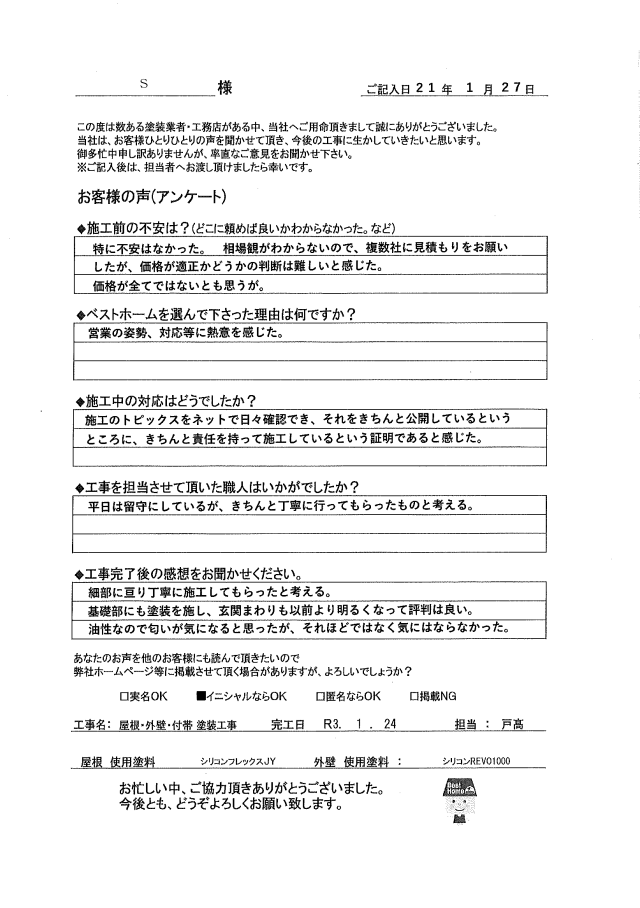 | 施工箇所 | 屋根・外壁・鼻隠し・軒天・ボードシーリング打替え・クラックコーキング・フード・雨樋・窓シャッター・シャッターBOX・基礎・ベランダ床・内部クロス張替え |