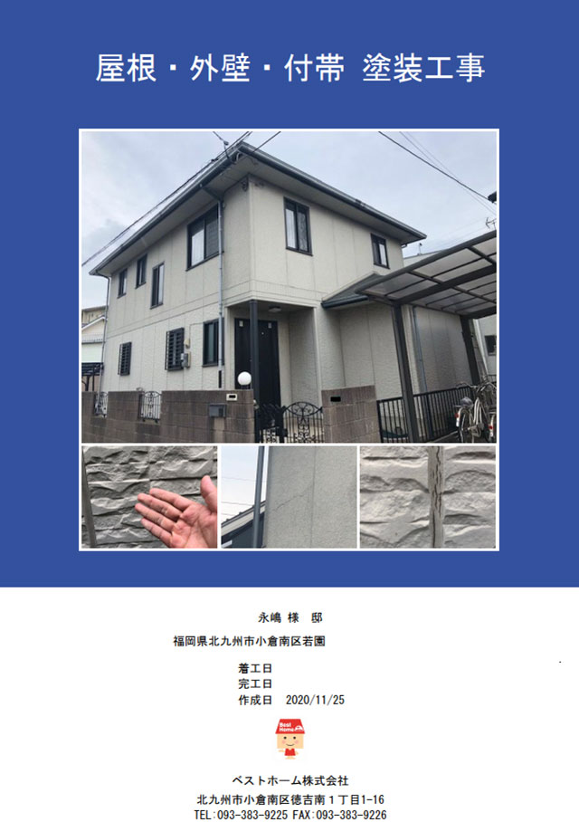| 施工箇所 | 屋根・外壁・鼻隠し・軒天・小庇・クラックコーキング・雨樋・配管・窓シャッター・シャッターBOX・ダクトカバー・土台水切・ベランダ床・基礎・外構塀 |