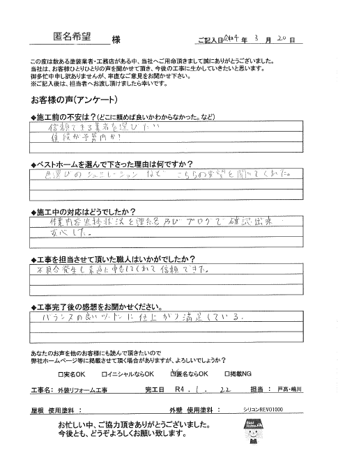 | 施工箇所 | 屋根・外壁・破風・鼻隠し・軒天・小庇・ボードシーリング(増打ち・打替え)・フード・雨樋・雨戸・戸袋・窓シャッター・シャッターBOX・ダクトカバー・土台水切り・ベランダ床・基礎・玄関増築・ドアリフォーム・浴室・クロス張替え・ガレージ廻り・和室 |