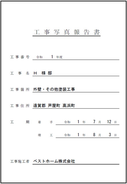 | 施工箇所 | 外壁・鼻隠し・軒天・帯・フード・玄関灯・雨樋・雨戸 ダクトカバー・玄関ドア・屋根水切・基礎 |