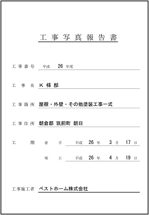 | 施工箇所 | 外壁・破風板・鼻隠し・軒天・小庇・帯・雨樋・雨戸・ シャッター・シャッターBOX・ダクトカバー・水切り・ 電気カバー・基礎 白蟻防除 |