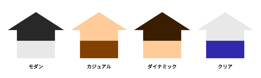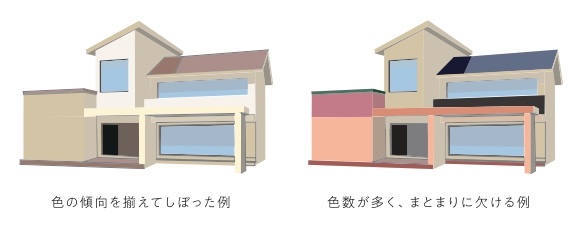一般的な建築/エクステリアにおいては、「まとまり=統一性」を重視し、色数を絞り込むことが優先されます。例外的に、華やかさ・楽しさ・にぎやかさは、色数を多く使って表現します。