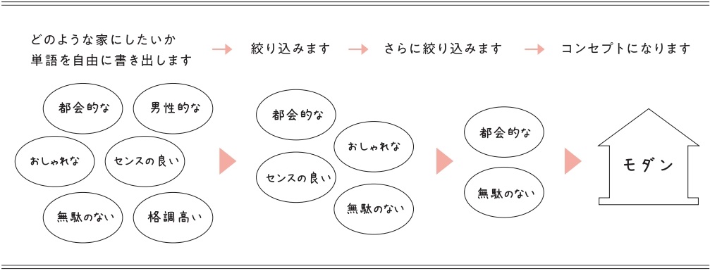 コンセプトを決めるとは「どのような家にしたいのか」を思い描くことです。まずは単語でもいいので、思いついた言葉をメモ用紙に書き出して見てください。