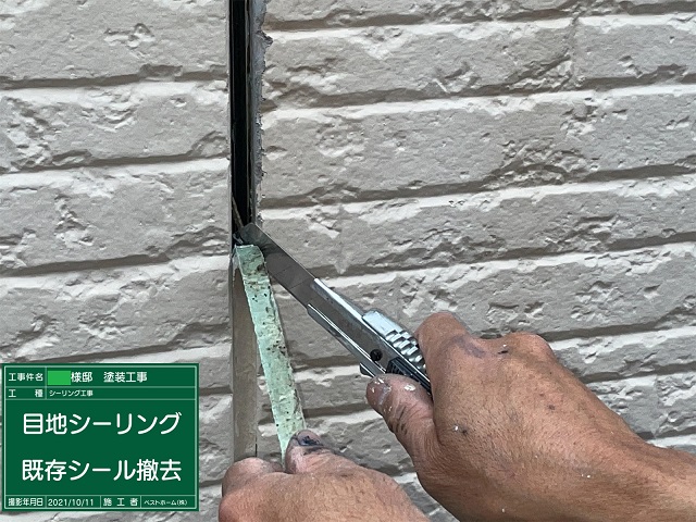 既存シーリングの撤去にはカッターを使用するため、外壁材を傷つけないように最新の注意を払っています。