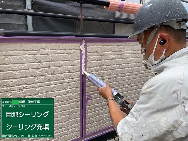 シーリング充填の際は、シーリング内に空気が入らないように目地底から丁寧に施工を行います。
