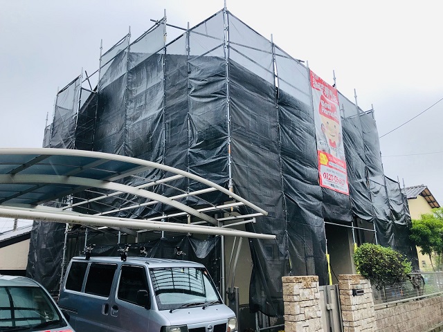 足場組立後は高圧洗浄の水や塗料の飛散を防ぐためにメッシュシートを張ります。