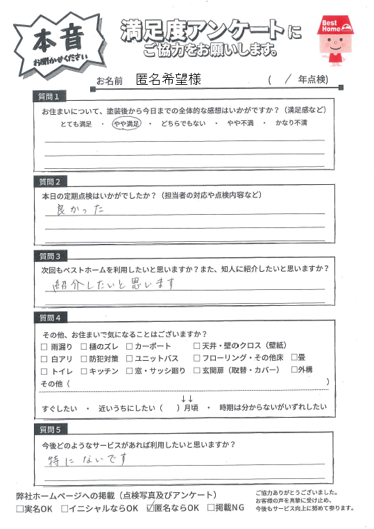 本日は八幡西区永犬丸にて1年点検に伺い、美観は維持できているか、劣化箇所や補修が必要な箇所はないか確認しました!点検結果、お客様からの声をぜひご参考ください。