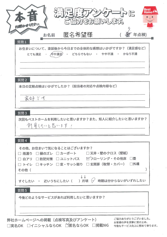 本日は小倉南区長行西にて9年点検に伺い、美観は維持できているか、劣化箇所や補修が必要な箇所はないか確認しました!点検結果、お客様からの声をぜひご参考ください。