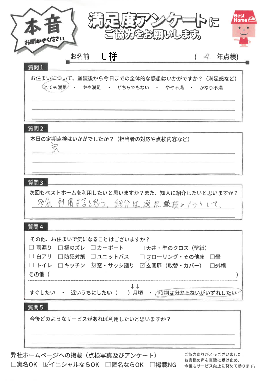 本日は遠賀郡岡垣町公園通りにて4年点検に伺い、美観は維持できているか、劣化箇所や補修が必要な箇所はないか確認しました!点検結果、お客様からの声をぜひご参考ください。