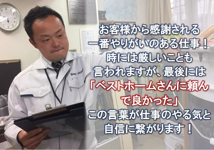 | 福利厚生 待遇 | 社内親睦会 リフォーム社員割引 時短勤務可(要相談) 社用車貸与(現場まわりは全て社用車利用) 制服貸与 |