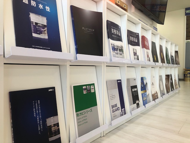 ショールームではお客様に最も適したプランをご提案するべく、塗料のカタログはもちろん、エクステリアや内装のカタログも豊富に取り揃えています。