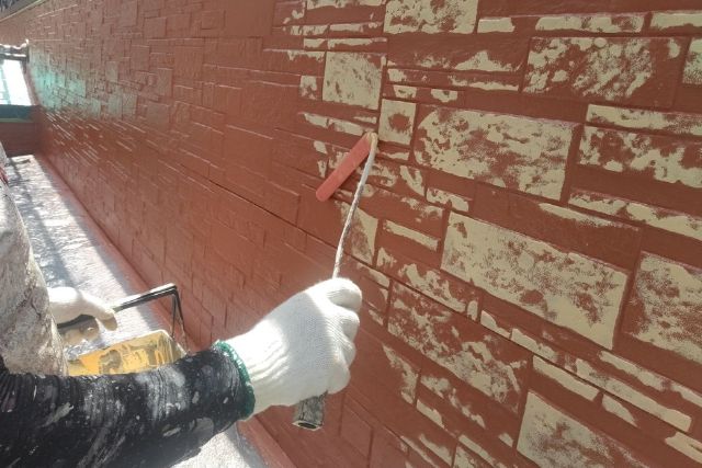 目地の色で外壁全体を塗布します。耐久性を確保するために最低2回の塗布が必要です。仕上がりを左右する重要な工程となるため省略してはいけません。
