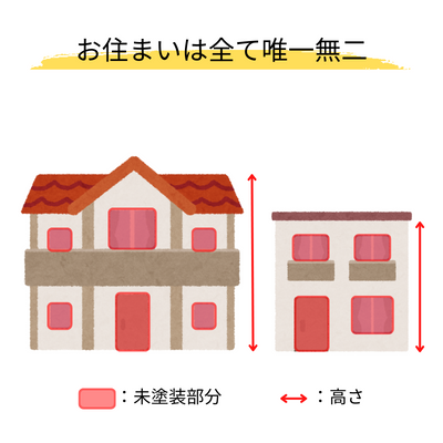 さらにお住まいによって高さも違い、平屋なのか、総二階なのか、下屋根があるのか、バルコニーが付いているのかなども塗装面積を出す際に大きく関係します。