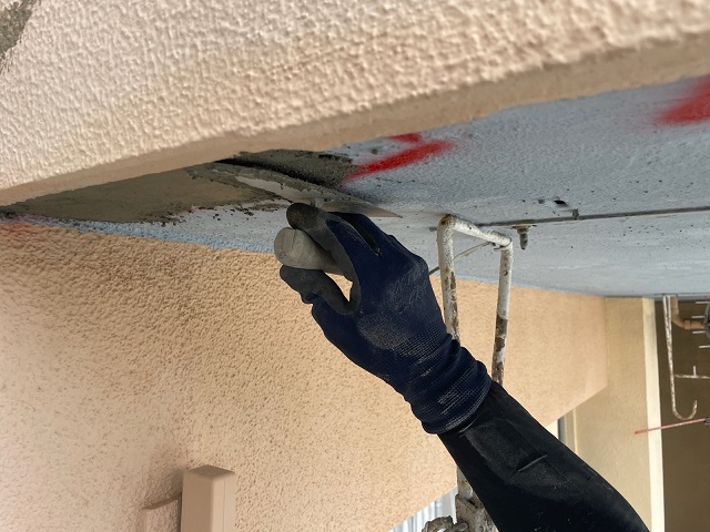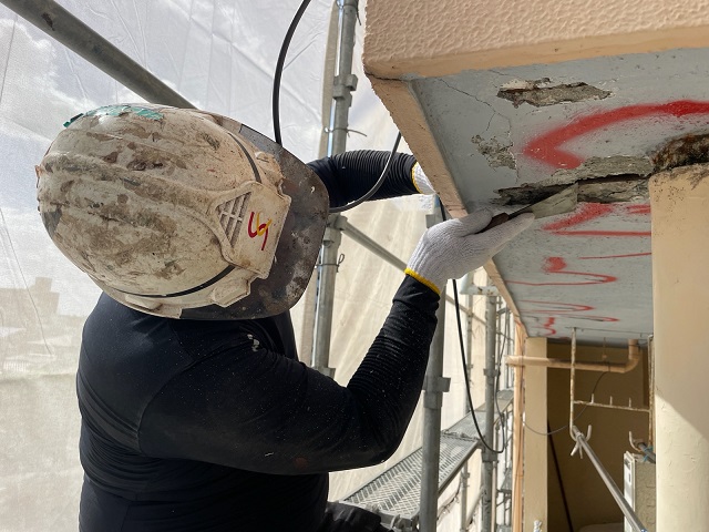 ①形を整えるために一度斫(はつ)って、中の鉄筋に錆止めを塗布。