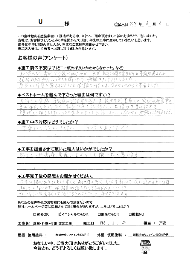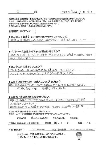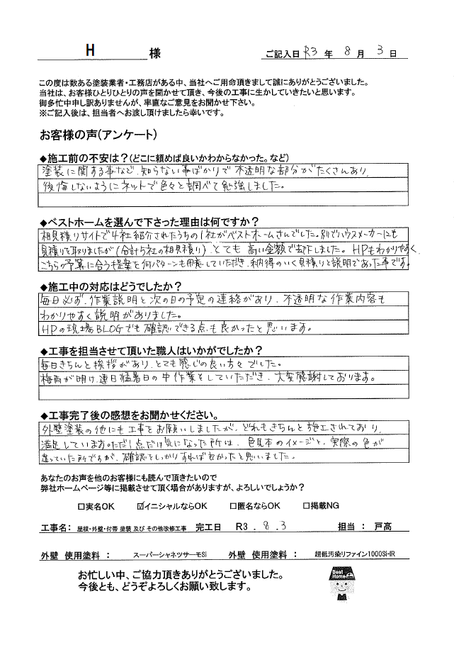 塗り替えを決断し、御社に施工頂いたことに感謝致します。