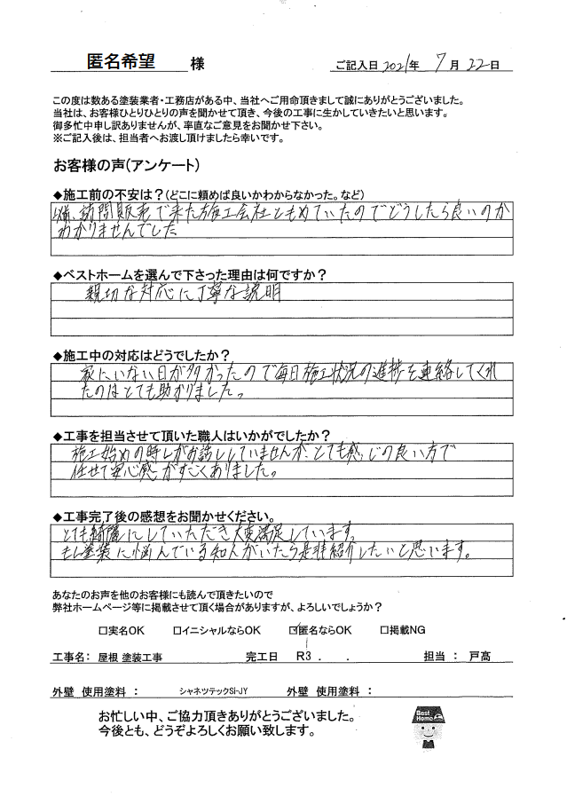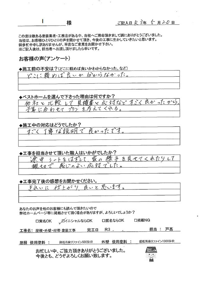 何社か見積りをとったのですが、ベストホームさんは説明が細かく、分かりやすく、対応が良かった。