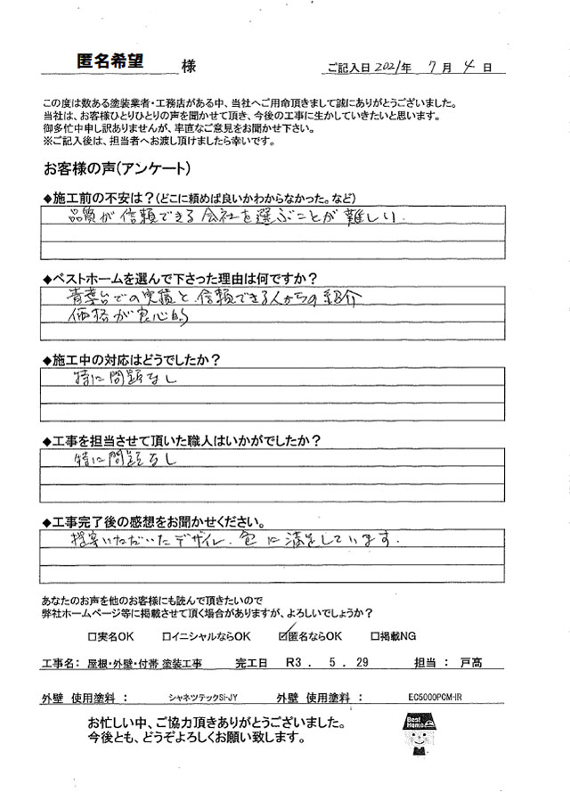 外壁塗装の他にも工事をお願いしましたが、どれもきちんと施工されており、満足しています。ただ1点だけ気になった所は、色見本のイメージと、実際の色が違っていた所ですが、確認をしっかりすれば良かったと思いました。