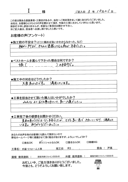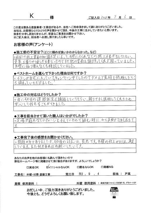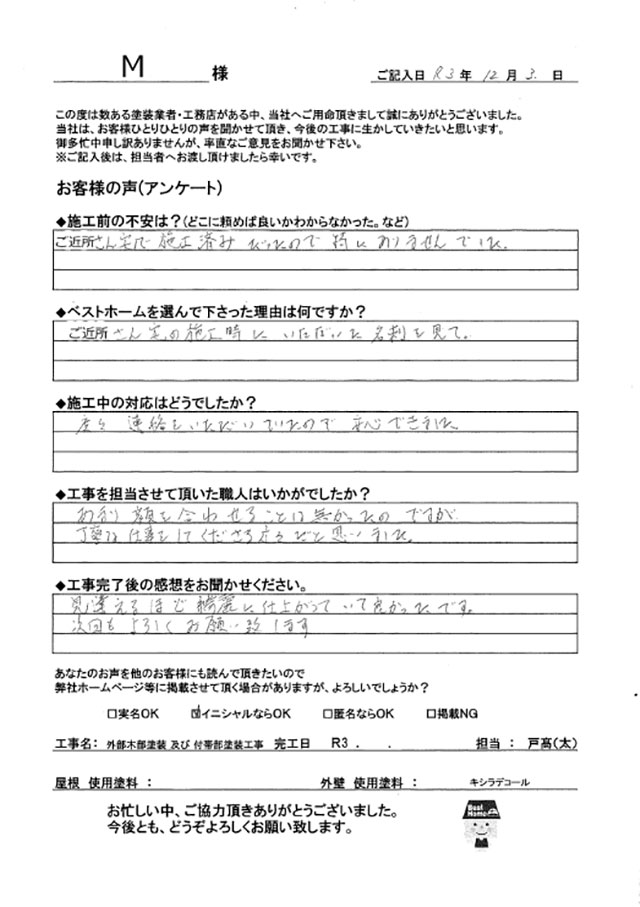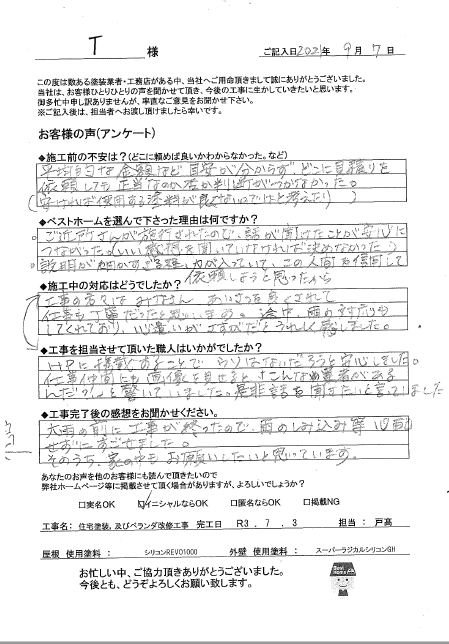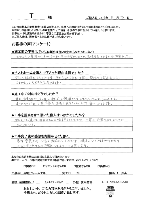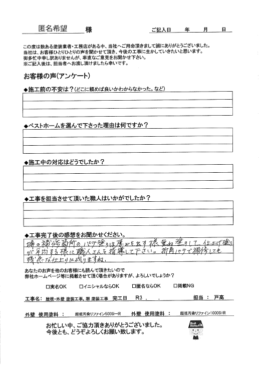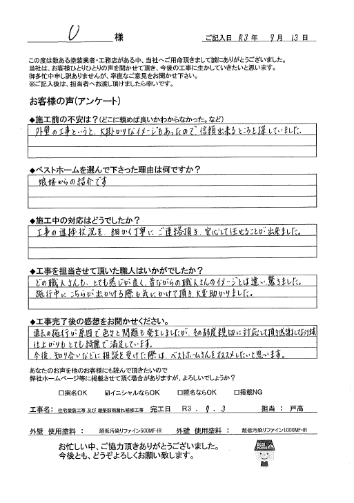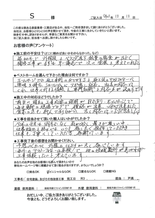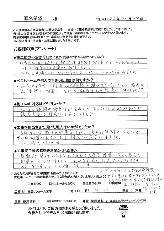 ※施主様のご希望により、お写真・アンケート用紙の掲載は控えさせていただきます。