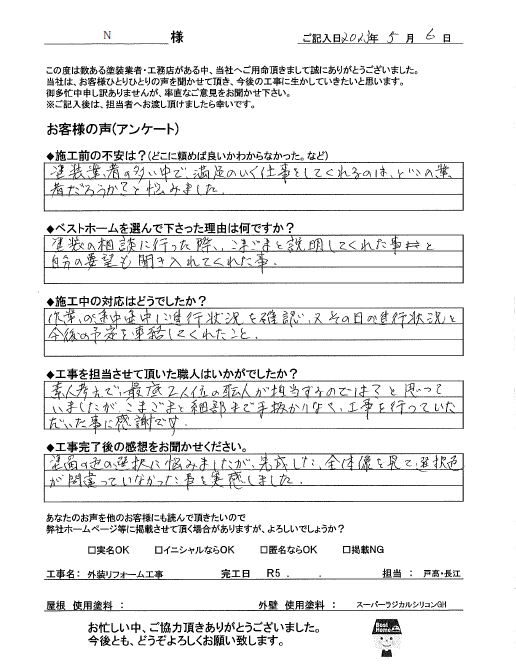 塗装工事は業者によって工事仕様が三者三様なので、不安も大きかったと思います。