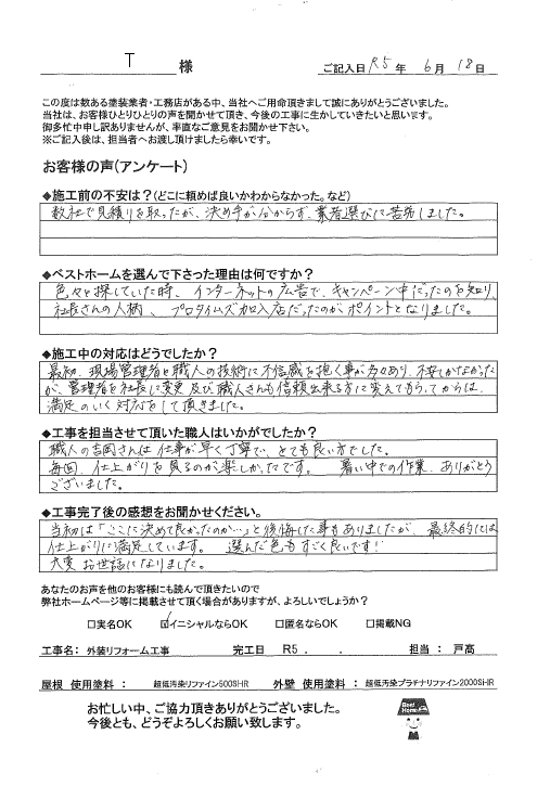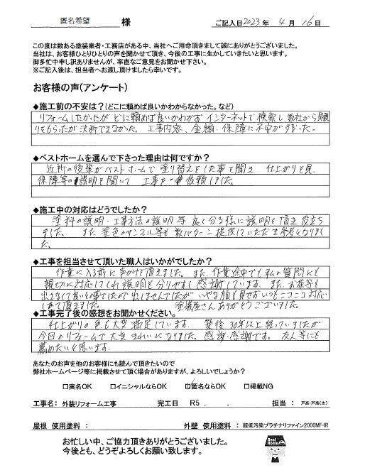 近所の後輩がベストホームで塗り替えをしたことを聞き、仕上がりを見て、保証等の説明を聞いて、工事を依頼しました。
