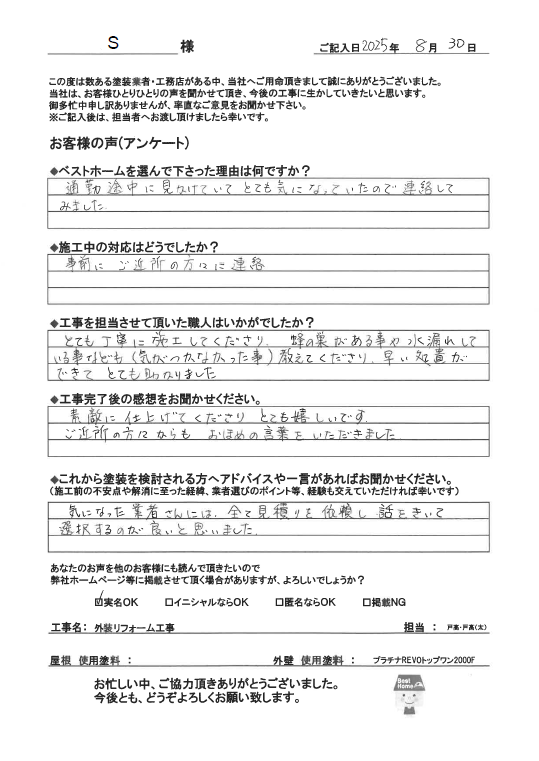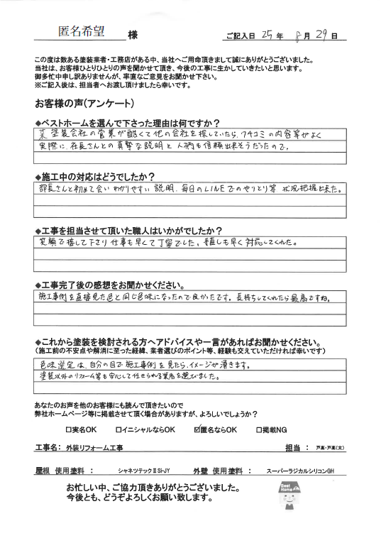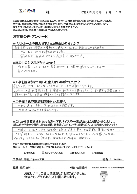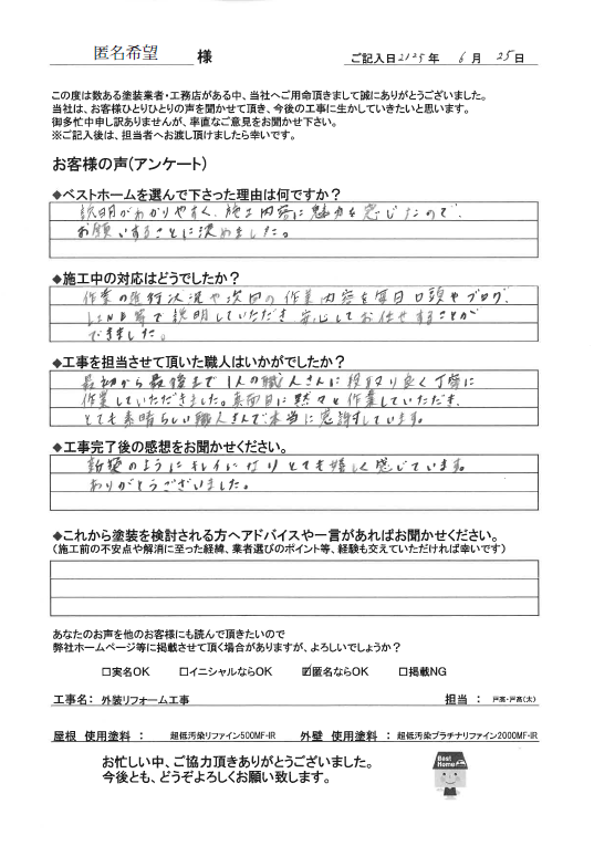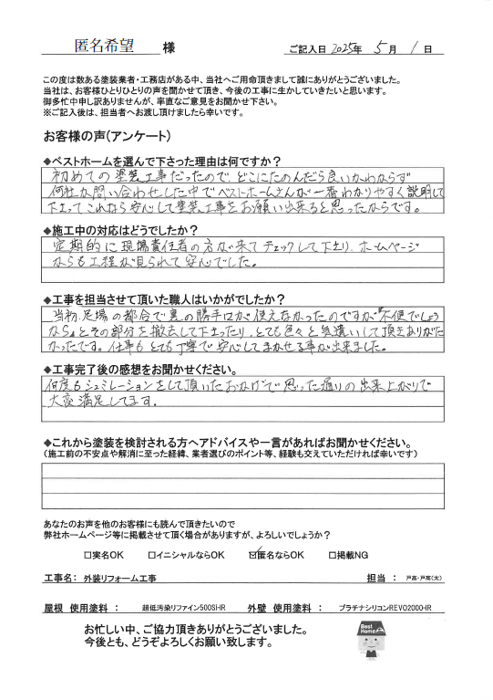 この度はベストホームに塗装工事をお任せいただき、誠にありがとうございました。