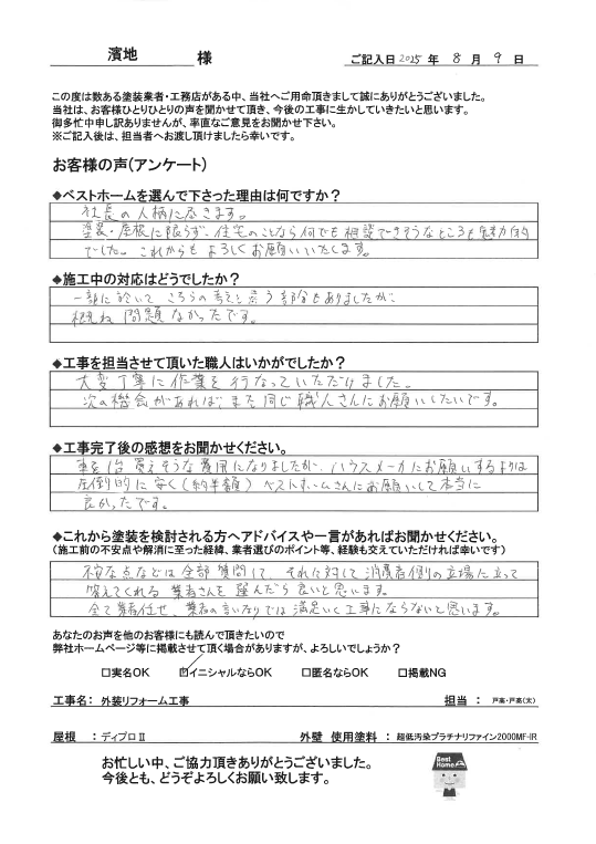 塗装・屋根に限らず、住宅のことなら何でも相談できそうなところも魅力的でした。これからもよろしくお願いいたします。